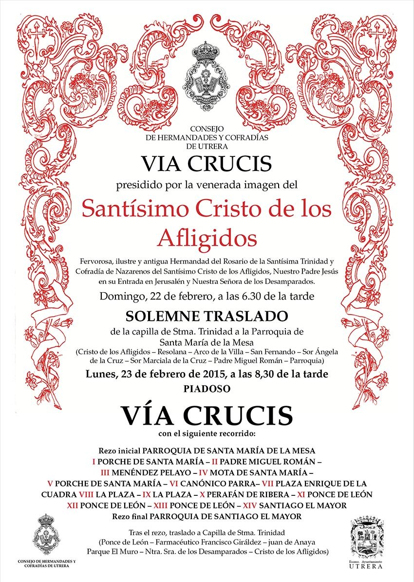 VIACRUCIS DEL CONSEJO DE HERMANDADES Y COFRADÍAS DE UTRERA 2015Santísimo Cristo de los AfligidosCon gran afluencia de fieles, la imagen del Stmo. Cristo de los Afligidos ha sido la protagonista el pasado lunes 23 de febrero en el Viacrucis del Consejo de Hermandades y Cofradías de 2015 por las calles de Utrera. La venerada imagen fue trasladada anteriormente el domingo 22 desde su capilla de la Stma. Trinidad a las 18:30h hasta la Parroquia de Santa María de la Mesa. Ya el domingo 23 se realizó piadoso Viacrucis a las 20:30h, partiendo desde la Parroquia de Sta. María de la Mesa hasta la de Santiago el Mayor. Posteriormente la imagen fue trasladada hasta su Capilla de la Stma. Trinidad. Si te gusta díselo a tus amigos: